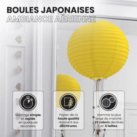 Ce type de boule chinoise est pratique pour les mariages, une Bar Mitzvah, une decoration anniversaire. Nos boules papier sont simples à déplier, il ne vous faudra pas longtemps pour décorer votre salle de couleur jaune. Le montage ne réclame pas d’outil compliqué. Pour un meilleur rendu, vous pouvez suspendre la suspension luminaire avec du fil de pêche ou de la cordelette. N’hésitez pas à faire passer un filin parcourant les hauteurs. Ces articles se marient bien avec les autres produits SkyLantern, les lampions LED, les étoiles, ou les rosaces.