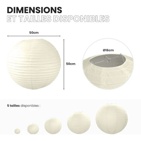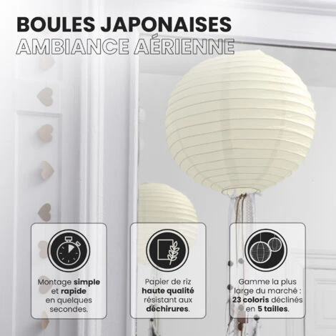 Ce type de boule chinoise est pratique pour les mariages, une Bar Mitzvah, une decoration anniversaire. Nos boules papier sont simples à déplier, il ne vous faudra pas longtemps pour décorer votre salle de couleur ivoire. Le montage ne réclame pas d’outil compliqué. Pour un meilleur rendu, vous pouvez suspendre la suspension luminaire avec du fil de pêche ou de la cordelette. N’hésitez pas à faire passer un filin parcourant les hauteurs. Ces articles se marient bien avec les autres produits SkyLantern, les lampions LED, les étoiles, ou les rosaces.