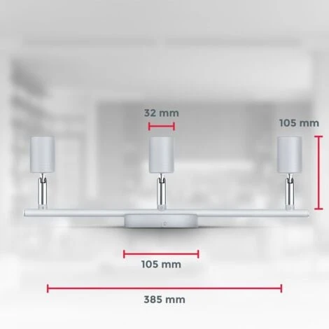 ECLAIRAGE : le plafonnier aux dimensions de 385x100mm est livré avec 3 ampoules GU10 d’une puissance de 5 Watt et d’une intensité lumineuse de 400 Lumen. La couleur de la lumière est blanche neutre.