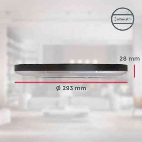 - Dimensions : La lampe de salon ronde mesure Ø293x28mm (DxH). La source lumineuse LED est montée au plafond à l’aide de 3 vis et le couvercle en plastique est ensuite fixé par un simple mouvement de rotation.