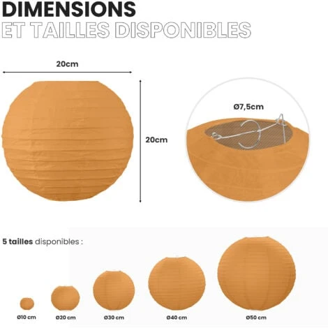Ce modèle de lampion est recommandé pour les mariages, une célébration d’anniversaire, ou une soirée entre amis. Nos boules papier sont faciles à installer, vous allez pouvoir inonder la pièce de couleur cumin. L’installation n’exige pas d’outil spécifique. Pour un meilleur rendu, vous pouvez fixer le lampion avec du fil de nylon ou une petite corde. Petite astuce: laisser courir un fil entre les murs pour donner une belle exposition à votre thème. Ces produits se marient totalement avec les autres lanternes de SkyLantern couleur Sauge ou Warm Grey par exemple. Si le cumin n’est pas exclusif dans votre déco, vous pouvez compléter avec plusieurs colorations accessibles dans nos rayons. Complétez avec différentes tailles en plus du diamètre 20 cm, diamètres proposés: de 10 à 50 cm.