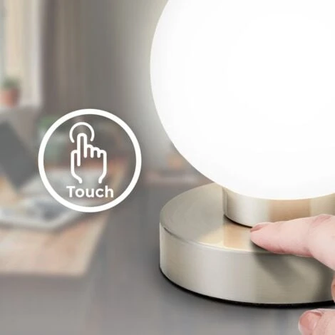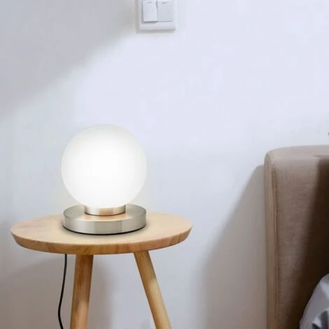 LUMINAIRE – 1 lampe de chevet tactile, abat-jour en verre forme ronde, socle en métal finition nickel matte, fonction dimmable, douille E14 (ampoule pas incluse).