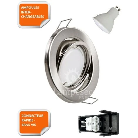 Spot led encastrable en kit se compose d’un spot encastrable orientable + une ampoule à led GU10 + une douille automatique (sans vis) GU10 avec avec connecteur d’alimentation. Connectez ce spot directement sur le secteur 230V sans transformateur et remplacez vos spots halogènes équivalent environ 50W.
