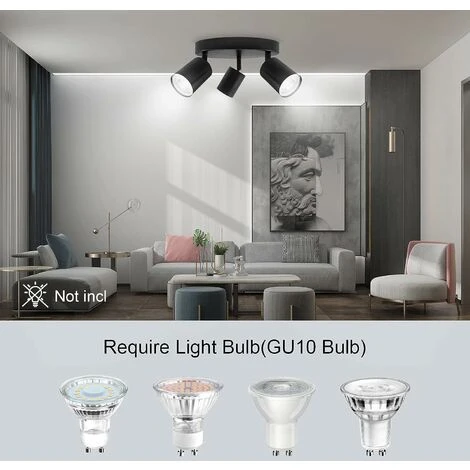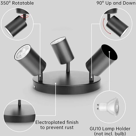Tête de projecteur réglableIl y a 3 douilles pour ce plafonnier. Chaque douille peut être ajustée individuellement, comme pivotée à 360° et basculée à 90° à l’envers. | Couverture galvaniséeLa surface de la lampe adopte un processus de galvanoplastie, avec une bonne texture, ce qui peut rendre la surface étanche à l’humidité et à la rouille. | Convient à toutes les ampoules GU10Veuillez noter que ce luminaire ne contient pas d’ampoules. Compatible avec les ampoules LED ou halogènes à culot GU10, il est recommandé d’utiliser des lampes LED à économie d’énergie pour 5W, et la puissance maximale des lampes halogènes ne dépasse pas 50W. |