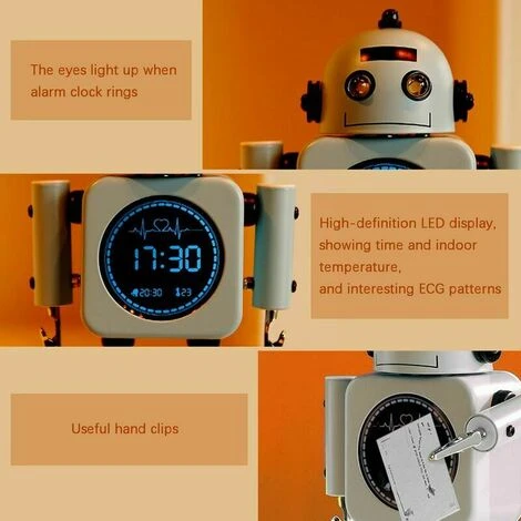 Version d’équipement avancée : réveil pour enfants, équipé d’un écran LED haute résolution, conception unique de formulaire ECG. Alors que le réveil affiche l’heure, il affiche également la température. Lorsque l’alarme se déclenche, les yeux du robot