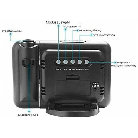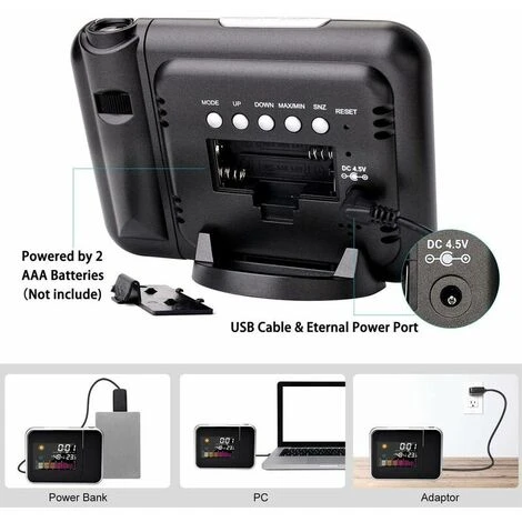 【Alimentation bidirectionnelle】 Le réveil à projection est alimenté par 2 piles AAA (non incluses) ou une entrée DC 4,5 V (câble USB inclus, adaptateur principal non inclus).