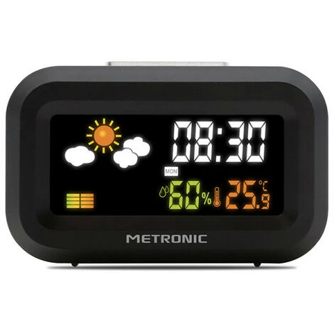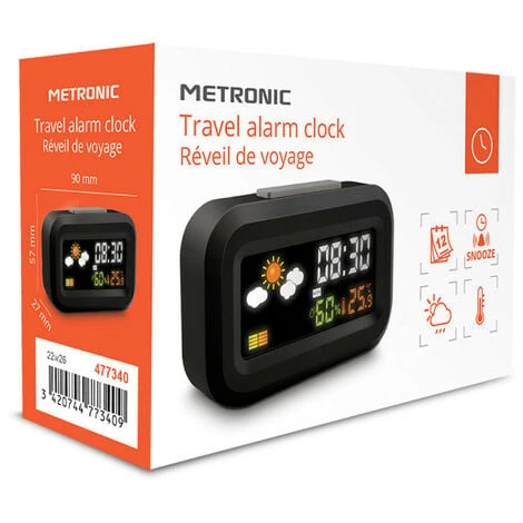 Où que vous soyez, réveillez-vous en toute sérénité avec le réveil de voyage Metronic. Pratique et multifonctionnel, il vous permettra de consulter l’heure, le calendrier, la météo, les températures et le taux d’humidité. Consultez-le très facilement dans la nuit : le bouton lumière vous permettra de voir l’heure pendant quelques instants et de vous rendormir dans le noir complet. Ce modèle compact est facile à transporter. Il ne prend pas de place dans vos bagages, sacs à dos ou sacs à main. Son alimentation avec 2 piles AAA vous assure son efficacité partout sans besoin d’électricité ni de câble. C’est le compagnon idéal pour vos voyages ou vos déplacements professionnels.
