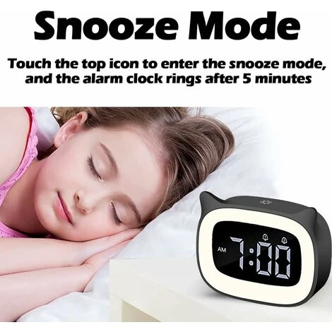 【Mode veille】lorsque l’alarme sonne, appuyez sur le bouton tactile sur le dessus pour passer en mode veille. Après cinq minutes, l’alarme retentit à nouveau. Appuyez sur n’importe quel bouton à l’arrière du réveil pour désactiver le mode veille.