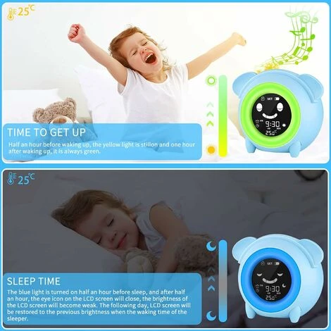 - Réveil Pour Enfant: le réveil enfants agit comme un coach de sommeil, aidant les enfants à se lever et à s’endormir avec différentes couleurs de lumière. La lumière jaune indique à l’enfant de se réveiller, la lumière verte indique à l’enfant de se